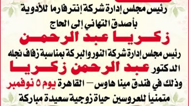 يتقدم الدكتور محمد هلال، رئيس مجلس إدارة شركة إنترفارما للأدوية، بأصدق التهاني إلى الحاج زكريا عبد الرحمن، رئيس مجلس إدارة…